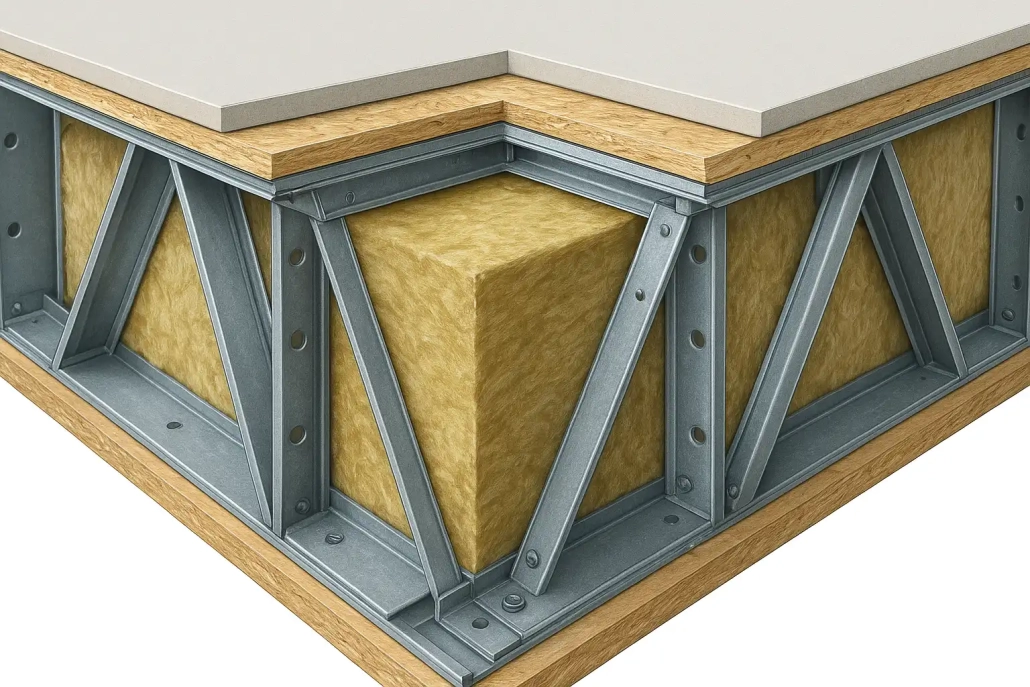 پروفیلهای فولادی سبک سرد نورد شده، به صورت شبکهای در سقف قرار گرفته و پایهای مستحکم برای تحمل بار وزن ساختمان ایجاد میکنند. عایقهای متنوعی مانند پشم سنگ، فوم پلی استایرن و فوم پلیاورتان، بسته به نوع پروژه انتخاب میشوند و فضای خالی میان اسکلت سقف را پر میکنند. وجود صفحات OSB که یک محصول مهندسیشده چوبی است، باعث انتقال یکنواخت نیرو و کاهش تمرکز تنشهای نقطهای میشود. در نهایت، پنلهای گچبرگ یا حتی پانلهای کامپوزیت برای پوشش داخلی سقف نصب میشوند که علاوه بر زیبایی، نقش محافظتی و ضدحریق نیز دارند.