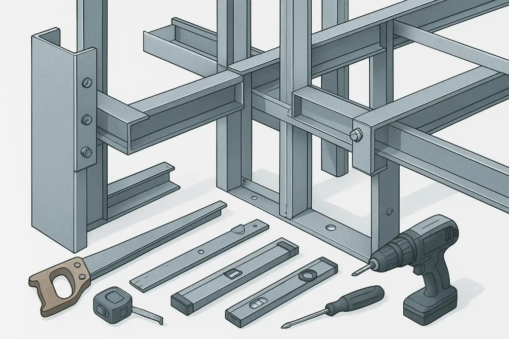 ابزارهای رایج در اجرای دیتیل سازه LSF عبارتند از دستگاههای برش (اره یا گیوتین)، انواع پیچگوشتی برقی یا بادی برای اتصال پیچ خودکار و پیچ و مهره، دستگاههای خمکاری پروفیل و تجهیزات اندازهگیری دقیق. برندهای شناختهشده در تولید پروفیلهای فولادی سبک شامل YAZDSTEEL، فولاد غرب، و برندهای خارجی مانند Knauf و Siniat هستند.