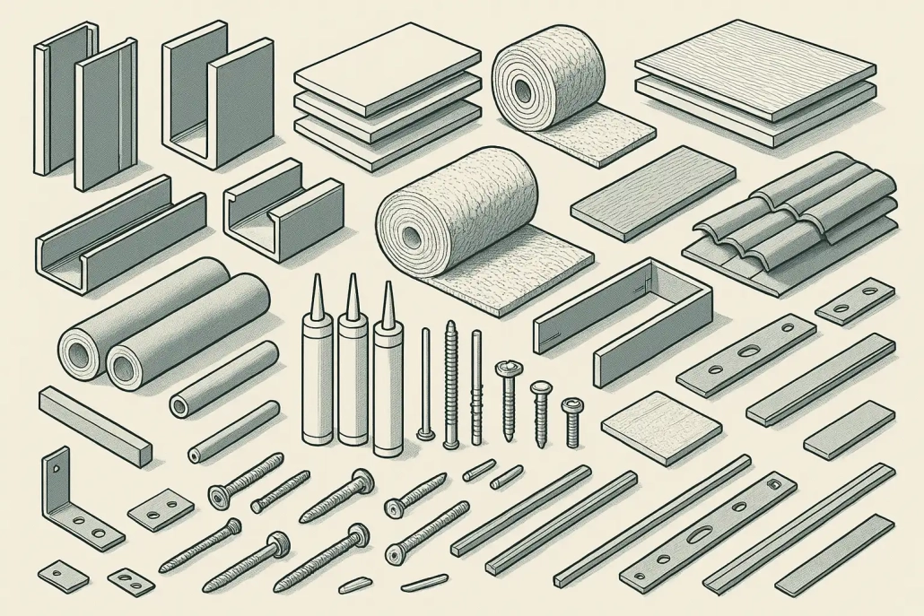 پیچ‌های مخصوص سرتخت یا نوک‌مته که برای اتصال پروفیل‌ها و نصب پانل‌ها به کار می‌روند، باید با تعداد و اندازه ذکر شوند. همچنین رولبولت و انواع اتصالات فلزی جانبی جزو مواردی هستند که گاهی از قلم می‌افتند اما بخش مهمی از بودجه را به خود اختصاص می‌دهند. پیشنهاد می‌کنیم همیشه از برندهای معتبر و دارای استاندارد برای این اقلام استفاده کنید تا ایمنی سازه تضمین شود.