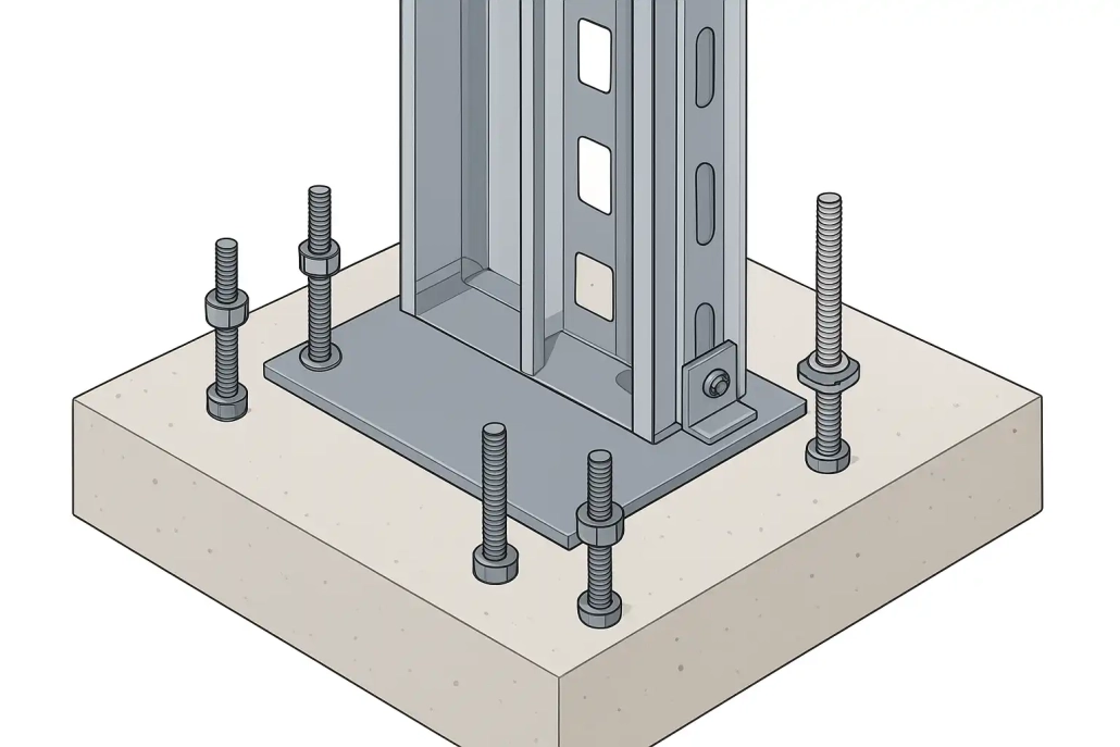 صفحههای اتصال (Base Plate)، عموماً از فولاد سرد فرم شده ساخته میشوند و پل ارتباطی بین بولتهای فونداسیون و سازه هستند. این صفحات با سطح نسبتا بزرگ خود، نیروهای وارد بر ستون را بر روی فونداسیون به شکل گستردهتری توزیع میکنند و مانع از تمرکز تنش و ایجاد ترک در بتن میشوند.