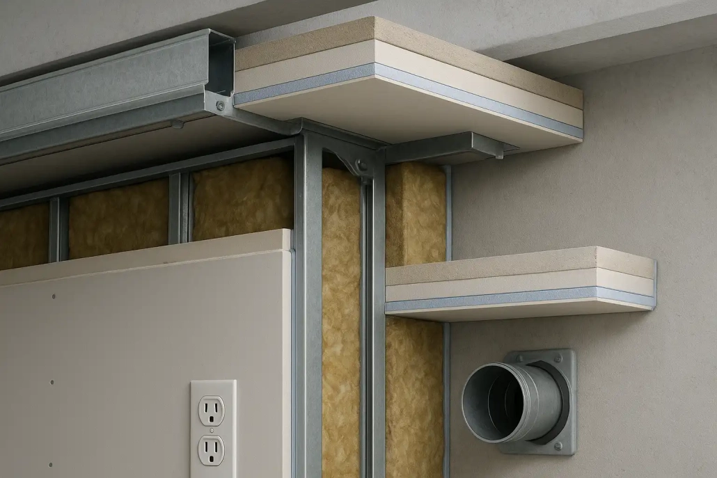 • عایق پشم سنگ یا پشم شیشه: این مواد به‌عنوان هسته بین لایه‌های دیوار یا سقف نصب می‌شوند و صدای هوابرد و کوبه‌ای را کاهش می‌دهند.