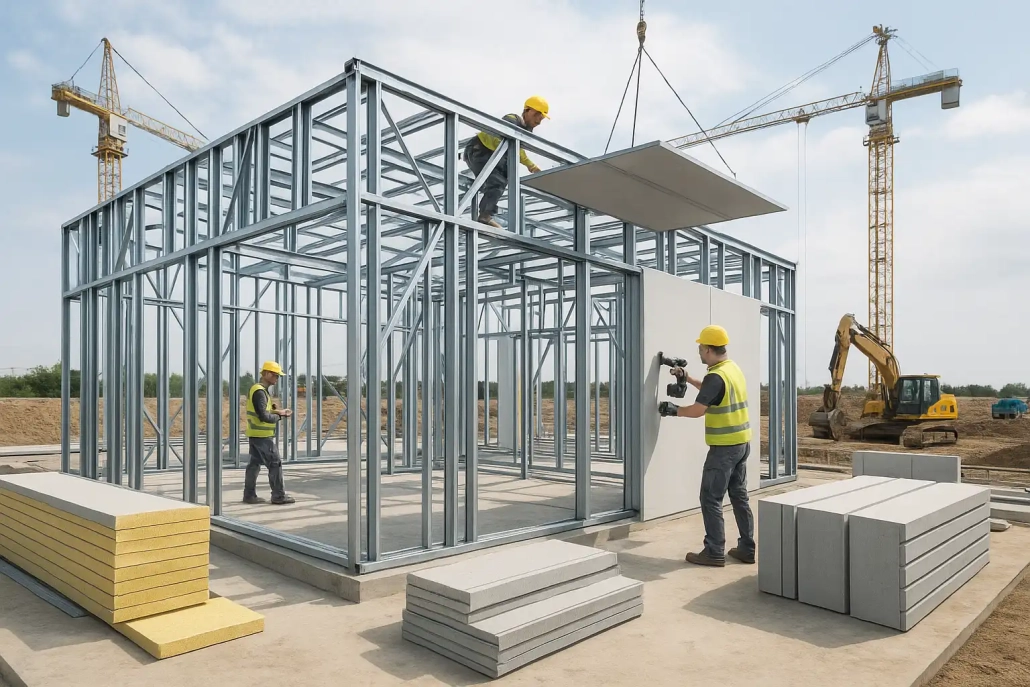 - اجرای پوشش داخلی و خارجی و عایقکاری: دیوارها با انواع عایق حرارتی و صوتی مانند پشم سنگ، فوم پلیاستایرن یا پلییورتان پر میشوند و سپس پوشش داخلی مثل گچبرگ و پوشش خارجی مثل فایبرسمنت یا سایدینگ نصب میگردد. این کار موجب عایقبندی مطلوب ساختمان میشود.